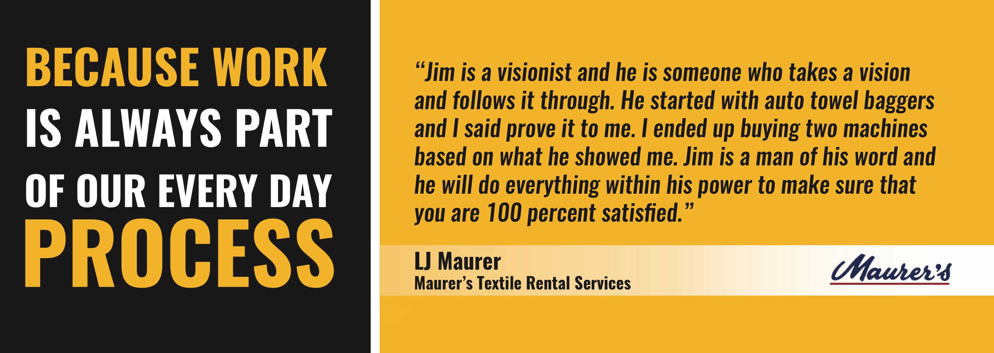 "It was the first mat roller I saw that convinced me; I could make money in the mat business. It fed the mats easily and they rolled out the back for convenient storage. Its solid belt made it safe to use. This Mat Master mat roller delivers tightly rolled ease to handle mats every day to this day in my West Bend, Wisconsin laundry." Said Jim.